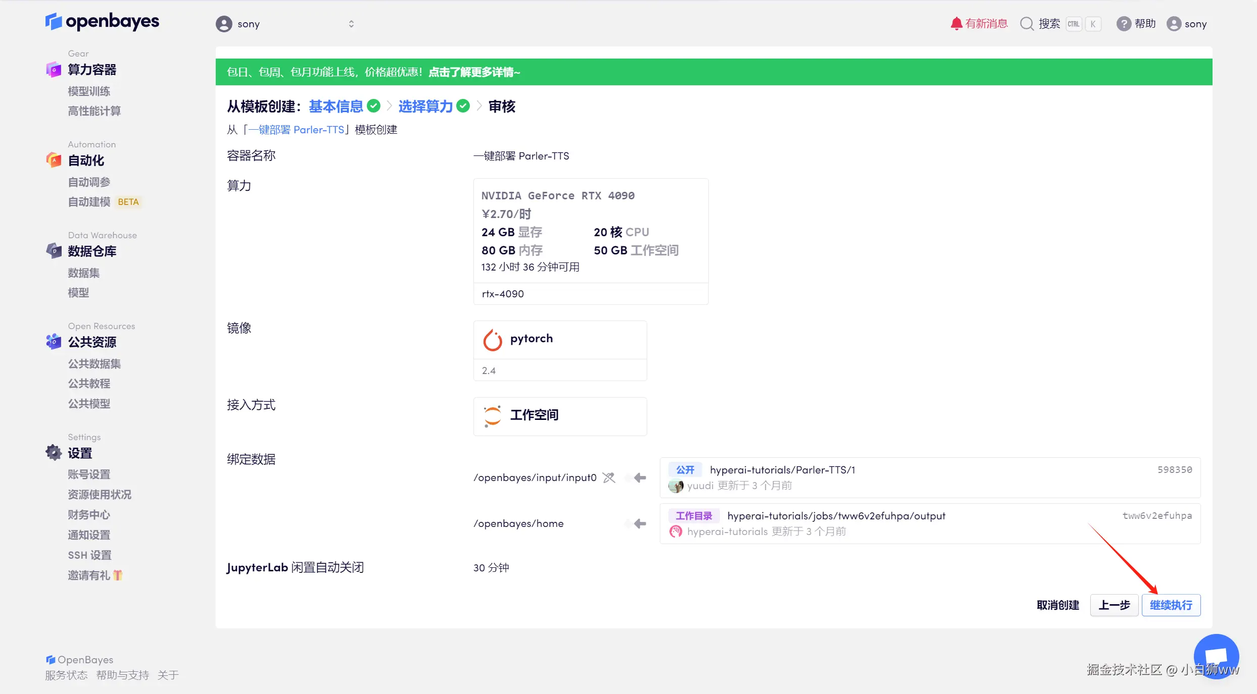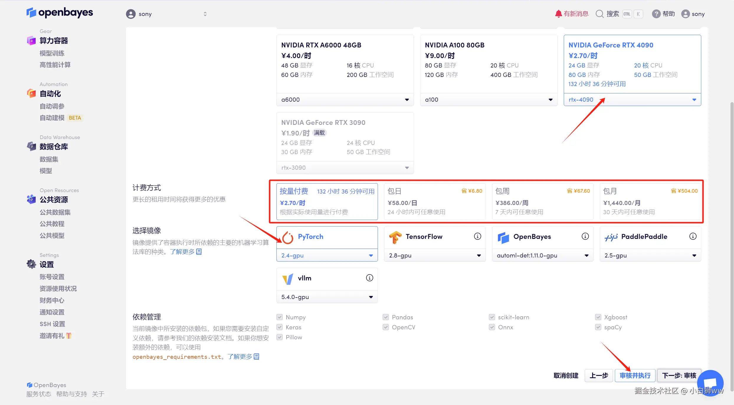平台会自动选择合适的算力资源和镜像版本,这里使用的是英伟达 RTX 4090 的算力和 PyTorch 的镜像,根据需求选择「按量付费」或者「包日/周/月」,点击「审核并执行」。可以使用文章开头的邀请链接,获得 RTX 4090 使用时长!