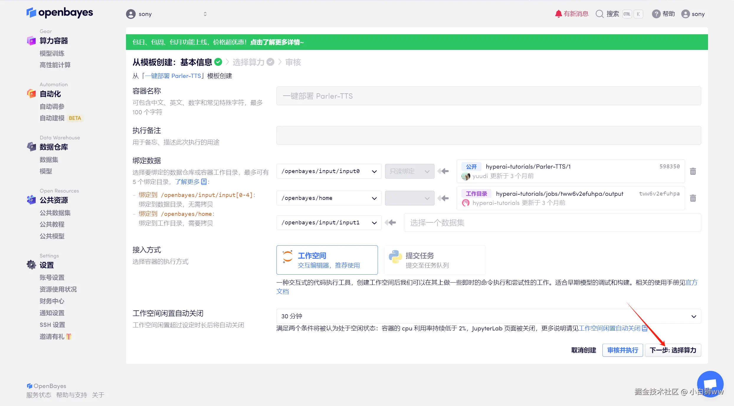 平台在克隆过程中已自动为我们配置好了模型文件,点击「下一步:选择算力」。