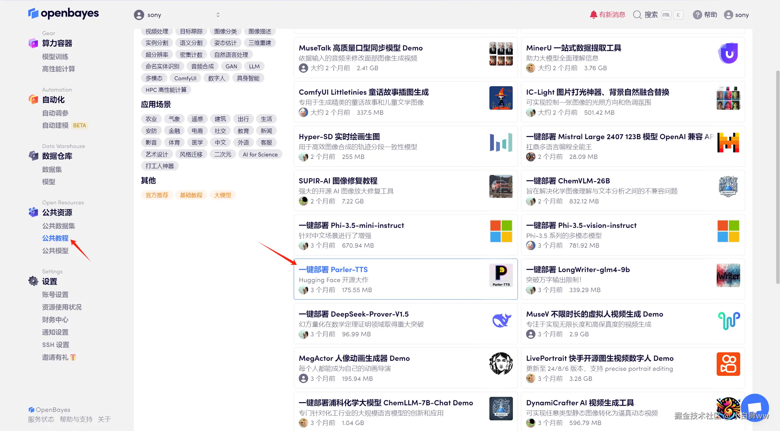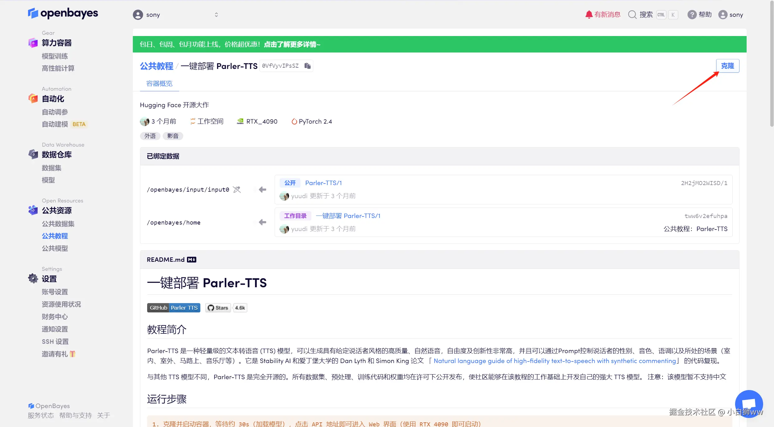 登录到 OpenBayes 平台后,打开「公共教程」,找到「一键部署 Parler-TTS」的教程。