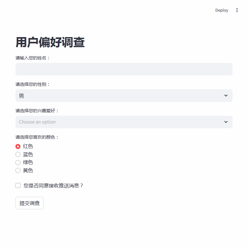 通过Streamlit的交互式组件,用户可以轻松地输入和选择信息,并提交给应用进行处理和显示。