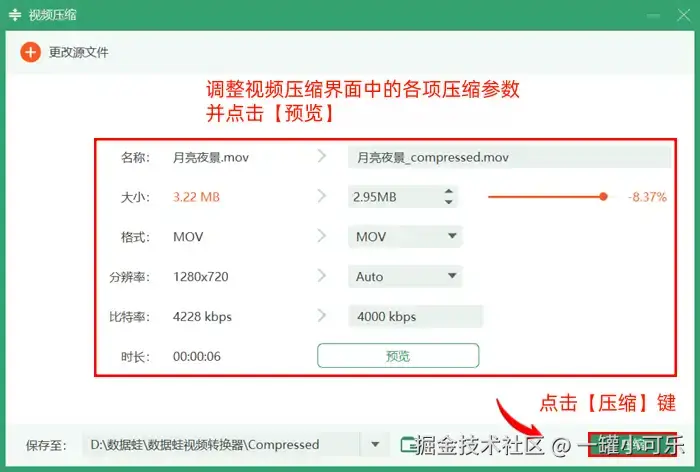 步骤3:调整视频压缩界面中的各项压缩参数,如调整视频大小选项,然后点击【预览】查看压缩效果,最后点击【压缩】键即可。