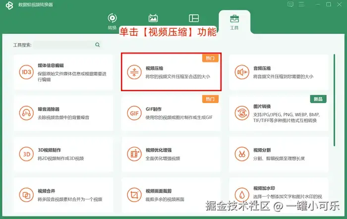 步骤1:打开该视频压缩工具,点击选择【工具箱】选项,在其显示的功能界面中,找到并单击【视频压缩】功能。