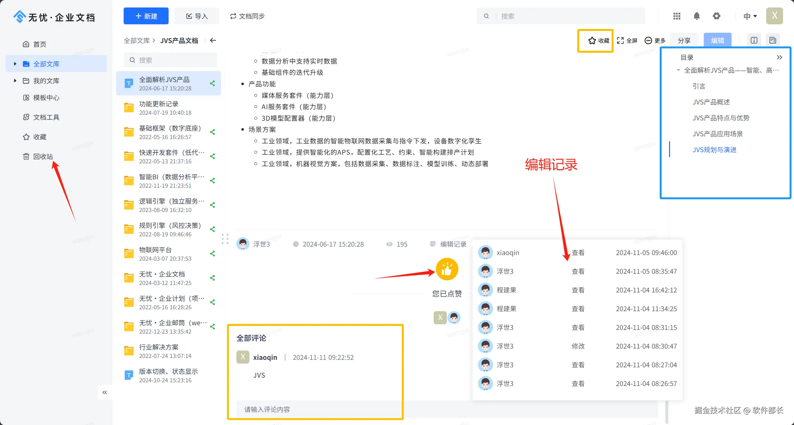 提供评论、点赞、收藏、下载、目录、编辑记录查询、回收站等功能
