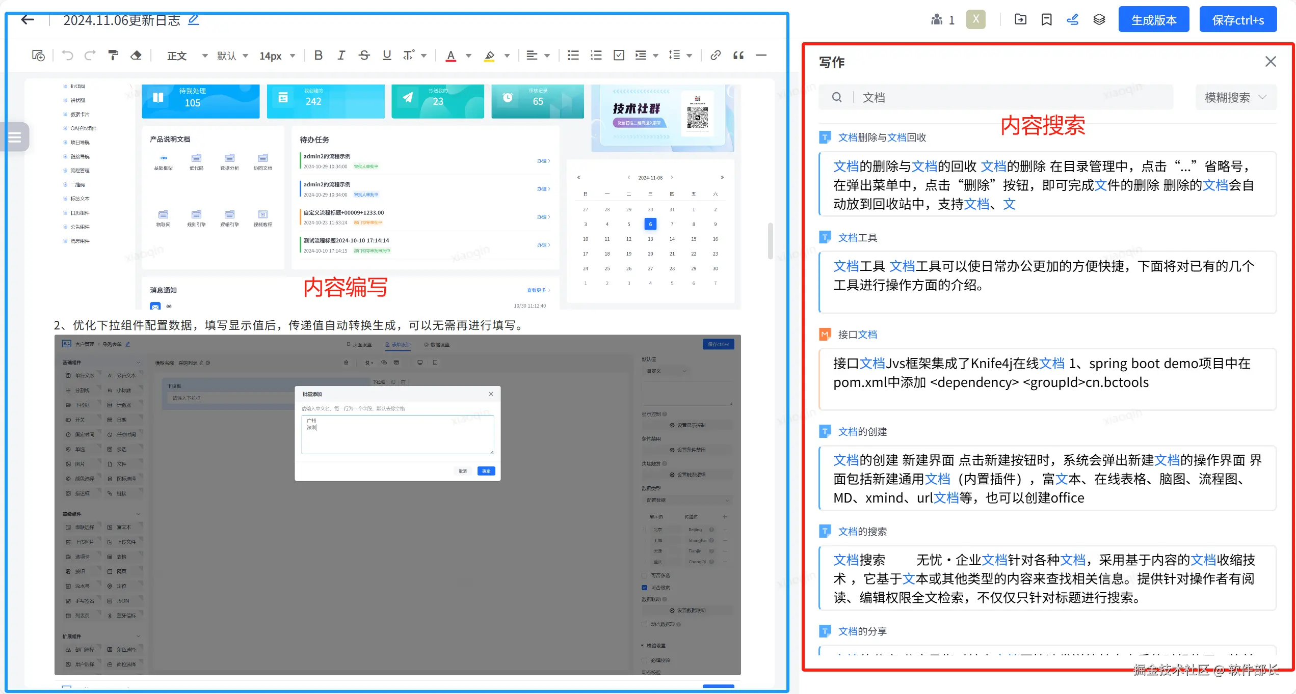 版本管理与历史记录:内容可选择版本保存,便于用户回溯和比较不同版本之间的差异,历史记录功能还能帮助企业了解文档的修改历程和变化过程。可随时切换和删除版本。