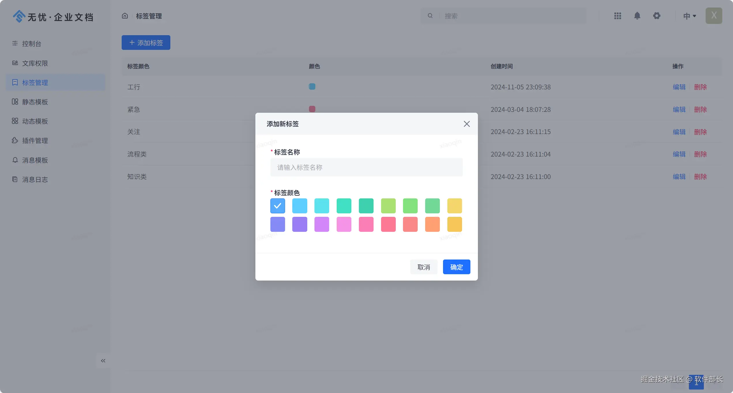 标签管理,在编写内容时,可以按照标签分类管理(文档检索时,也可以选择搜索标签的内容),标签名称可自定义