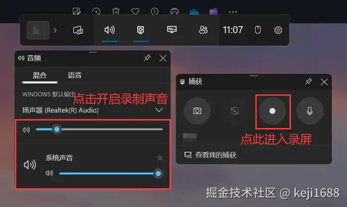 步骤2:按下快捷键 【Win+G】 ,打开录屏功能,开启需要录制的声音后点击录制按钮进行录制。