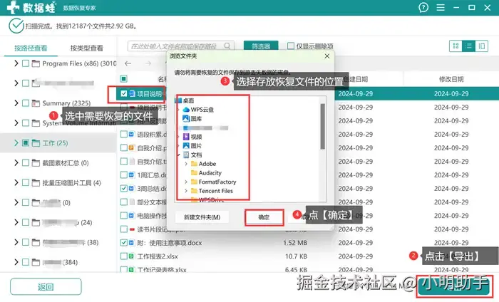 步骤2: 在扫描结束后,选择自己需要恢复的文件,点击【导出】,最后在弹窗上选择恢复文件的存储位置。