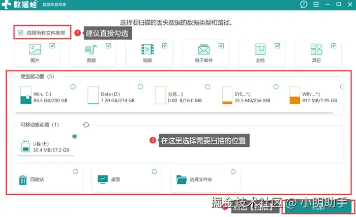 步骤1: 在电脑打开数据 蛙恢复专家这款软件,然后勾选首页上方的【选择所有文件类型】,在勾选需要扫描的位置,最后点击【扫描】。