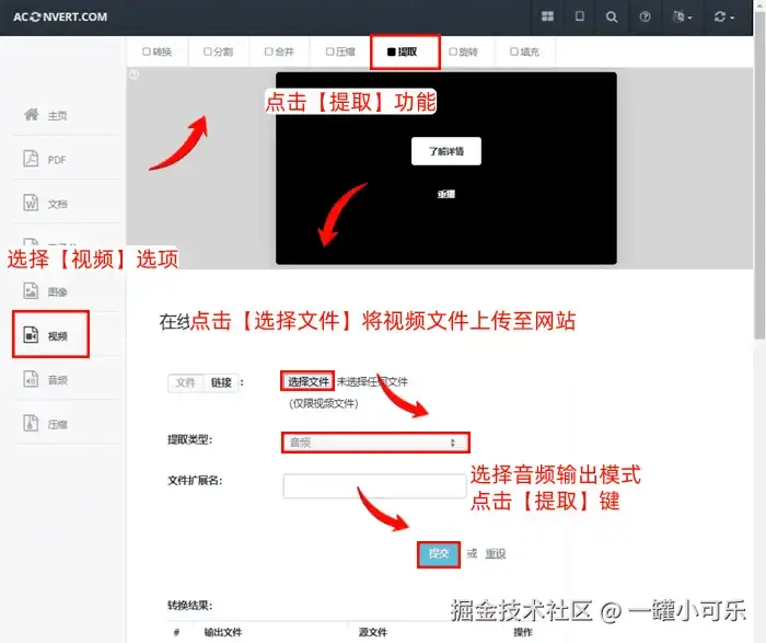 Aconvert也是一个在线音频提取工具,同样支持用户免费从视频中提取音频。与Zamzar相比,Aconvert提供了无损音质输出的模式,有音质要求的用户推荐使用该网站。但用户也需要注意该网站会有不定时的广告弹窗,需谨慎操作,避免误点导致病毒入侵设备。