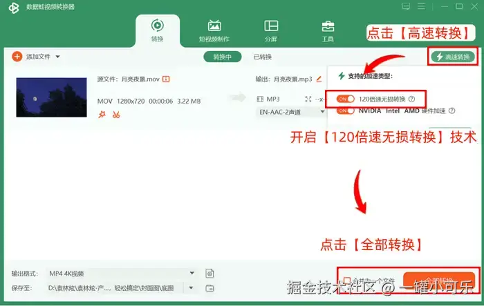 步骤3:点击【高速转换】,开启【120倍速无损转换】技术,最后点击【全部转换】,等待视频转换为音频完成,即可得到单一的音频文件。