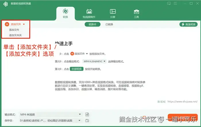 步骤1:运行数据 蛙视频转换器,进入文件格式转换界面,单击 【添加文件夹】/【添加文件夹】 选项,从本地文件夹中导入视频文件。