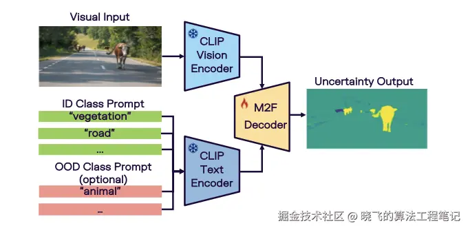 为了在测试时整合 Q 个新的OOD概念,需要通过 Q 个额外的项 cos(vi,tK+1),…,cos(vi,tK+Q) 扩展公式1中的掩码分类得分 ci 。遵循公式2,即通过将 c∈[0,1]N×(K+Q) 的前 K 个通道与掩码预测得分 s∈[0,1]N×H×W 进行组合,获得最终的不确定性得分 u∈RH×W :