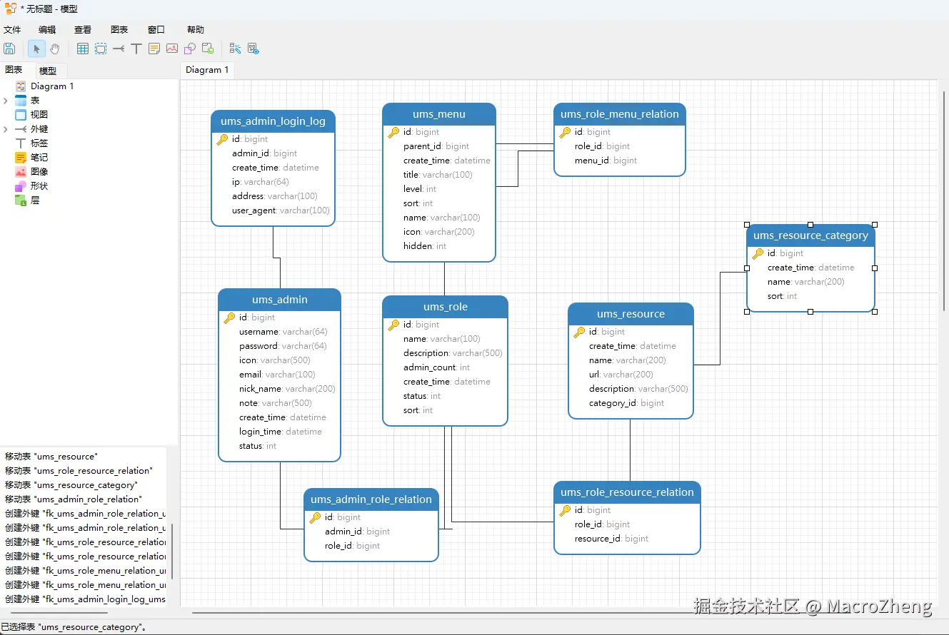 - 我这里使用Navicat的数据库设计功能,设计了下mall电商实战项目的权限模块,对比之前使用的PowerDesigner,确实界面现代化了不少;