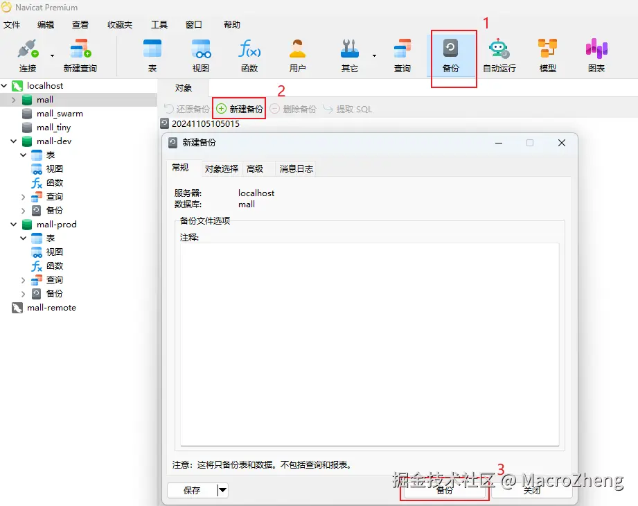 备份->新建备份来创建一个新的数据库备份;