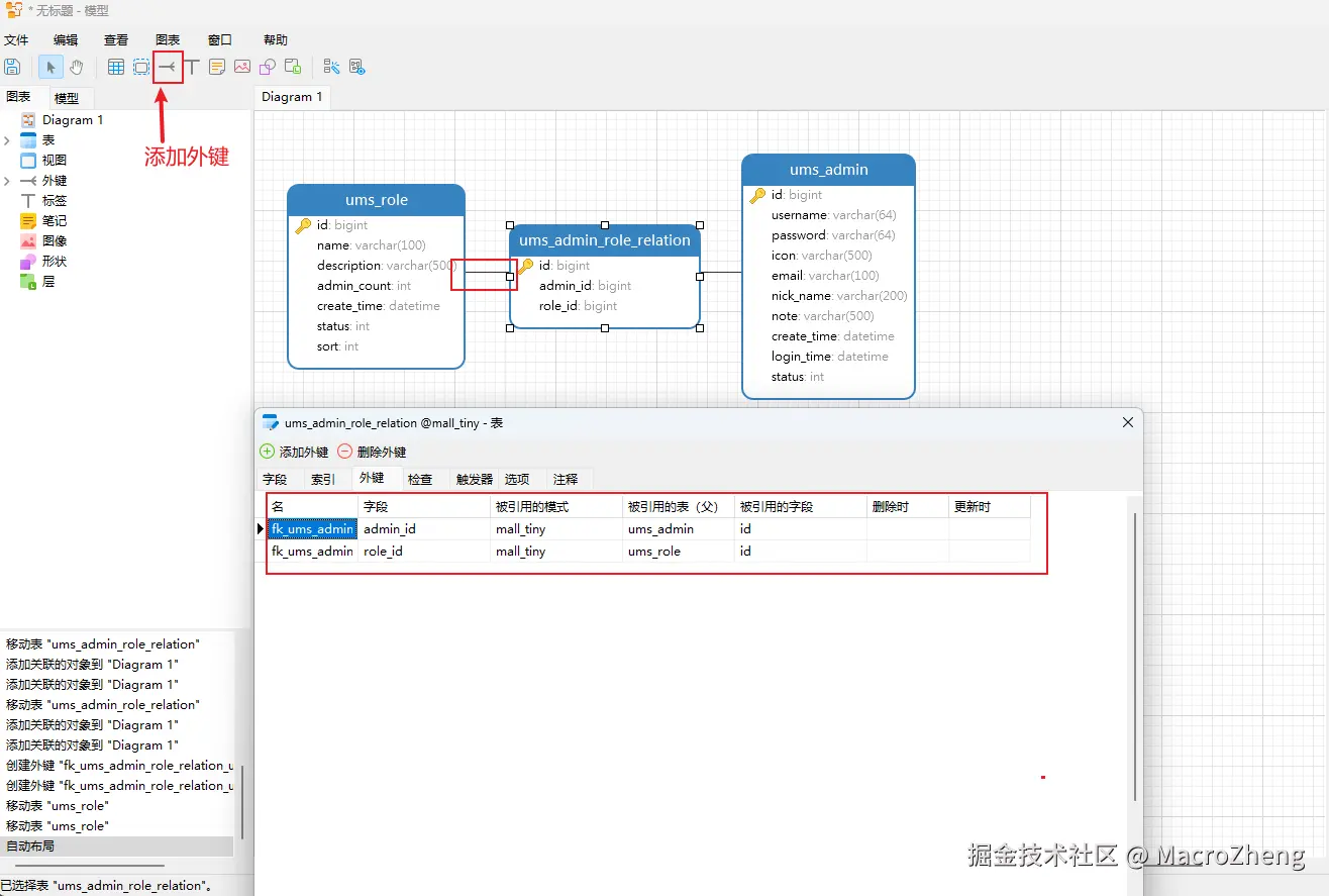 建立外键,我们只需点击添加外键按钮,然后拖动到需要建立关系的两个字段上就可以完成外键的创建了,这里的后台用户和角色之间具有多对多的关系;