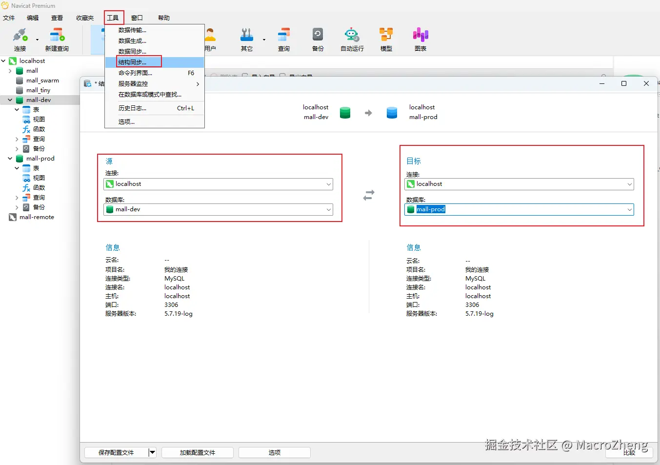 我们在开发项目的时候,数据库往往也是迭代开发的。比如我们的生产环境目前只开发了权限和商品模块,我们的开发环境新增了订单模块,此时就会有从开发环境将表结构同步到生产环境的需求,此时我们就可以使用Navicat的结构同步功能了。