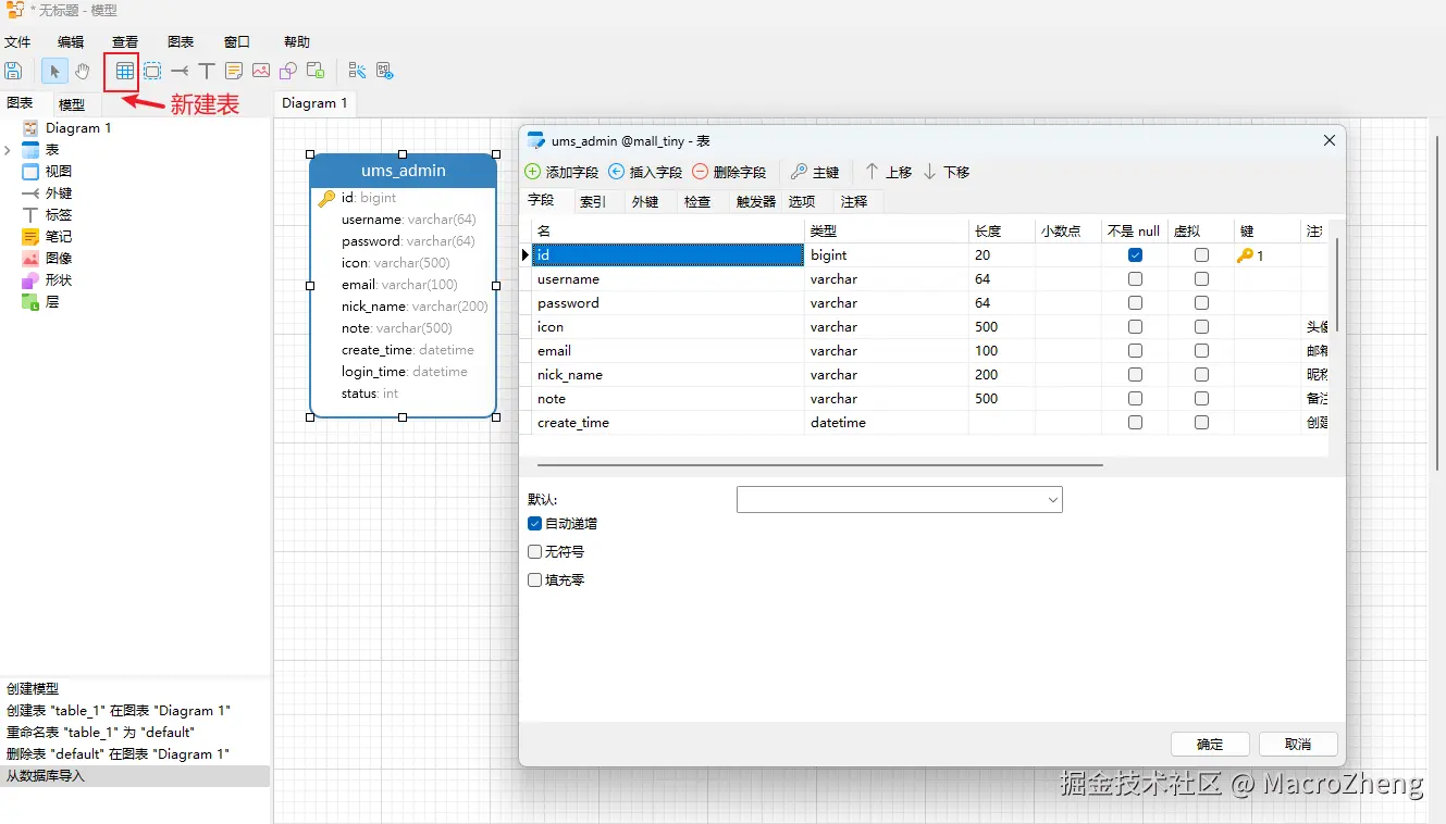 新建表的按钮来创一张表,之后就可以对表添加字段了,这里我添加了一张后台用户表ums_admin;