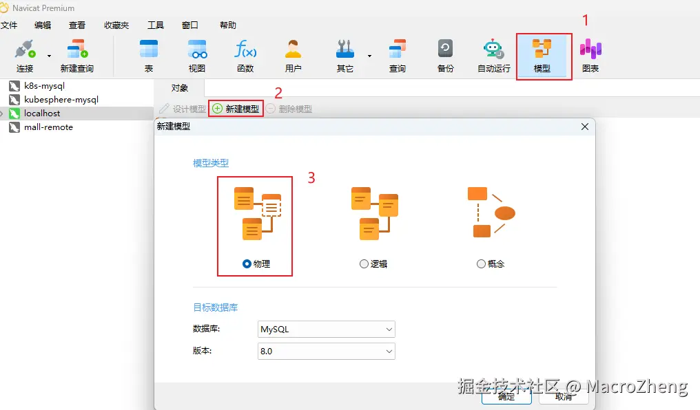 模型按钮打开数据库设计功能,通过新建模型来创建一个MySQL的模型;