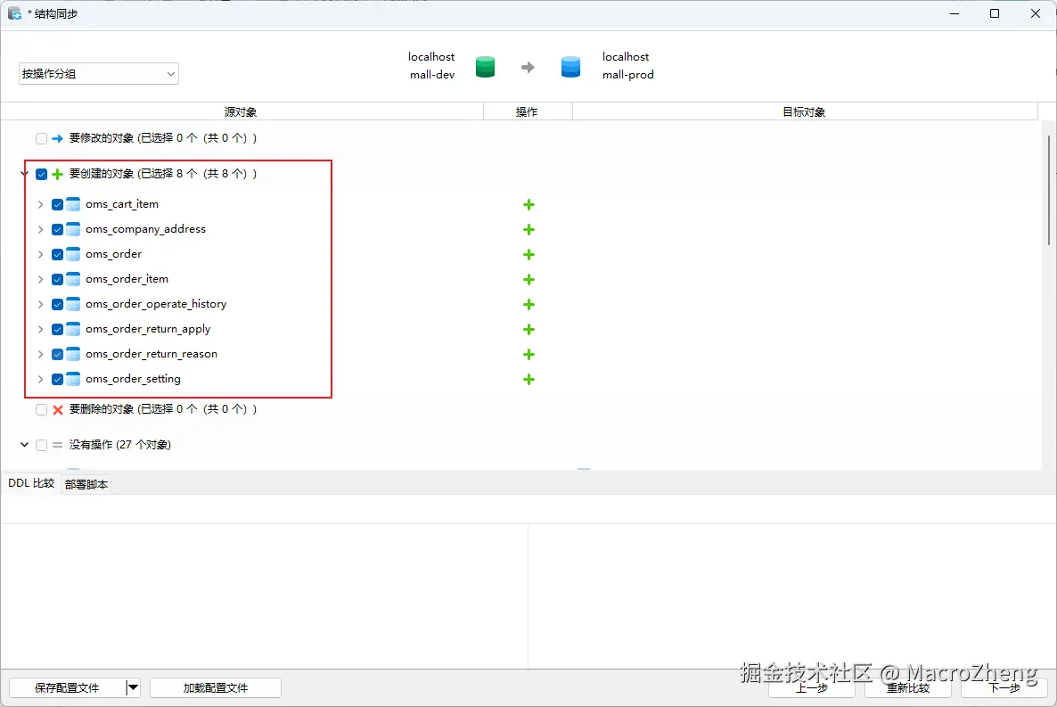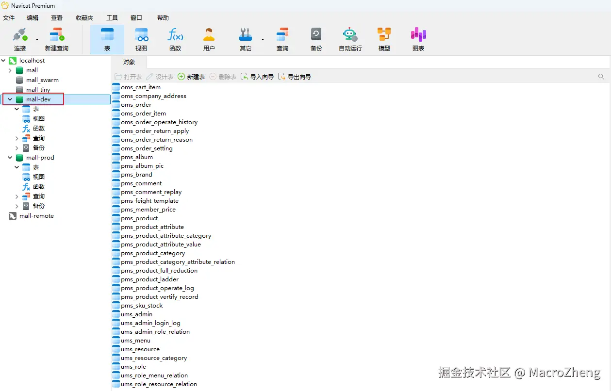 mall-dev,包含权限、商品、订单模块的数据库表,此时想将mall-dev的数据库表同步至mall-dev上去;