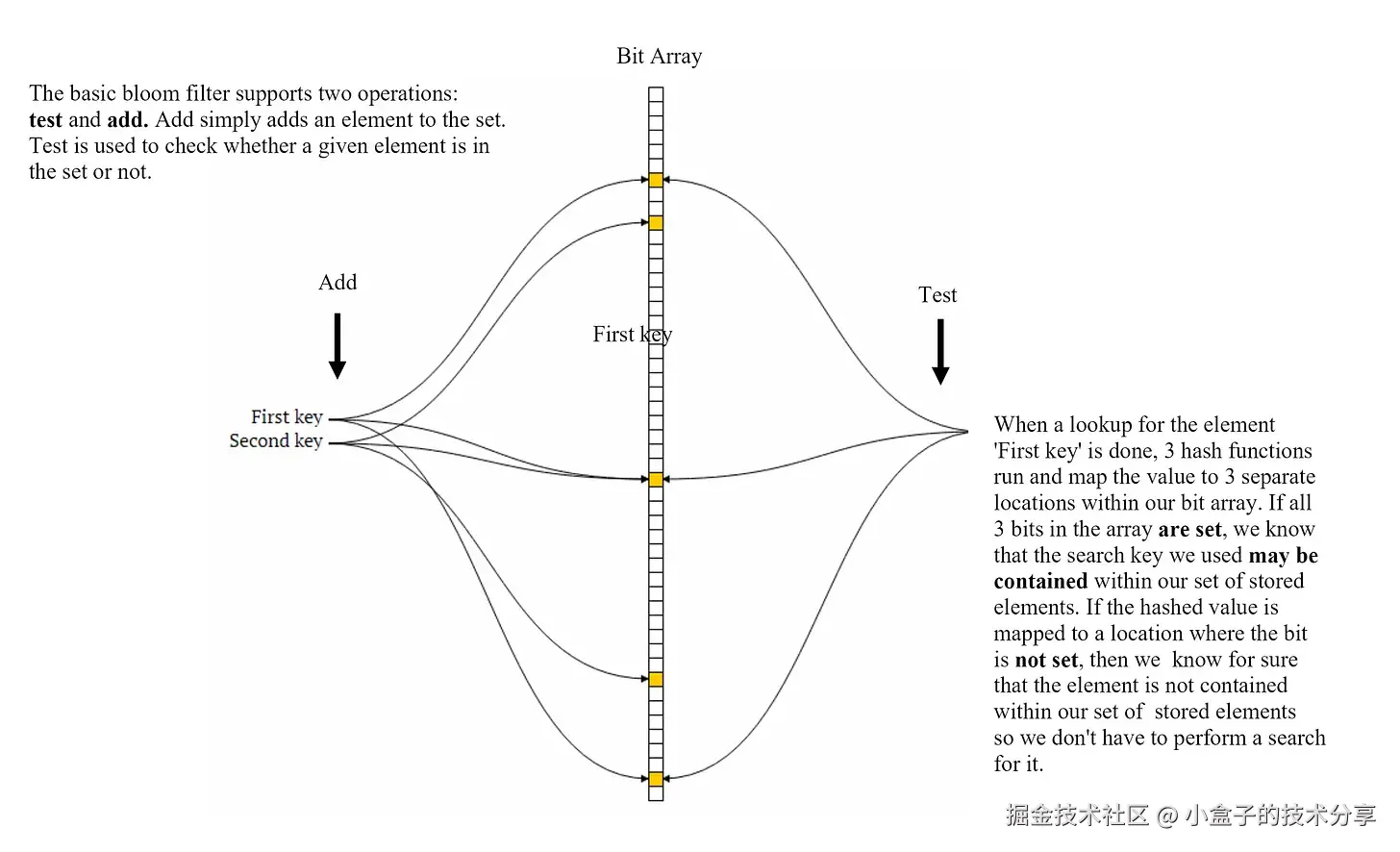 它使用位数组来存储数据。为了将一个键映射到适当的位,它使用多个独立的哈希函数,每个函数将键映射到位数组中的不同位位置。