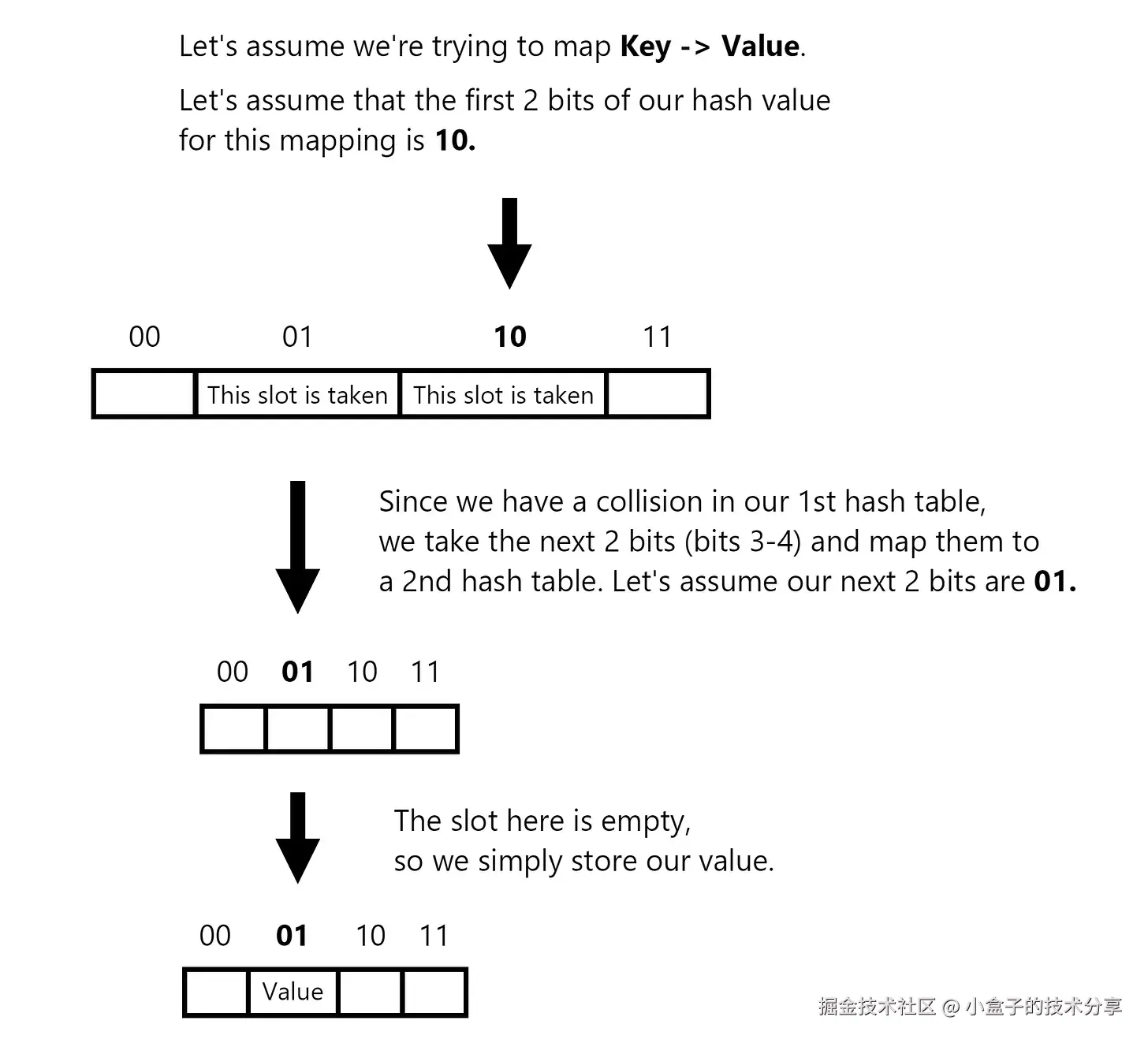 HAMT 是一种结合了哈希表和 Trie 的优点,用于高效存储和检索键值对的数据结构。它在计算机科学中常用于实现关联数组或字典。在 HAMT 中,键被哈希以确定其在数组中的存储位置,该数组称为哈希数组。哈希数组中的每个条目可以存储多个键值对,从而实现高效的内存利用。如果多个键哈希到相同的数组索引,则使用类似 Trie 的结构来解决冲突。