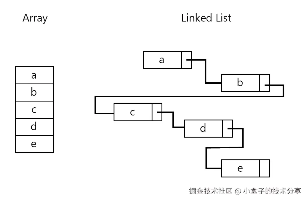 数组在内存中连续存储,以快速查找而闻名,但更新/写入时间较慢;而链表非连续存储,以快速更新/写入而闻名,但查找较慢
