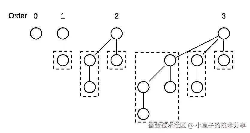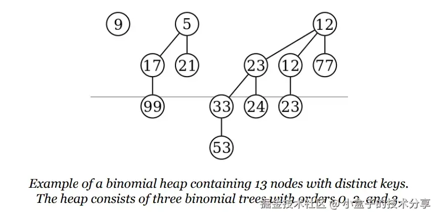 每个堆中的二叉树都遵循最小堆属性:节点的键值大于或等于其父节点的键值。此外,每个顺序只能有一个或零个二叉树,包括零阶。