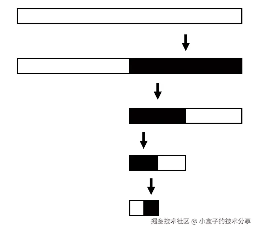 这是一个对排序元素的搜索,通过不断将搜索空间分成一半来完成。就像在字典中找到中间页面,检查我们的搜索词是在字典的左半部分还是右半部分,然后不断重复这个过程,直到找到元素。使用高效的 O(log(n)) 查找
