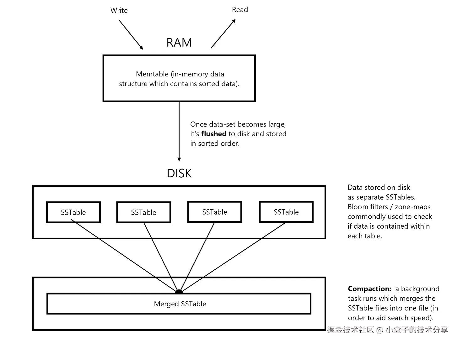 最初,数据被写入一个称为 Memtable 的内存结构中。这个 Memtable 在内存中保存数据,直到达到一定大小,通常通过使用平衡搜索树(如红黑树)、跳表或哈希表来实现,以提供高效的读取访问。当 Memtable 满时,其内容会被写入磁盘作为新的 SSTable。这个过程称为刷新。
