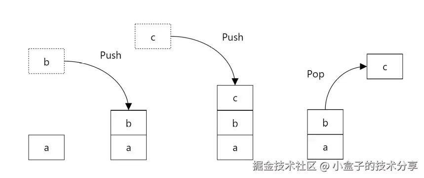 遵循后进先出(LIFO)原则,元素从顶部添加和移除:
