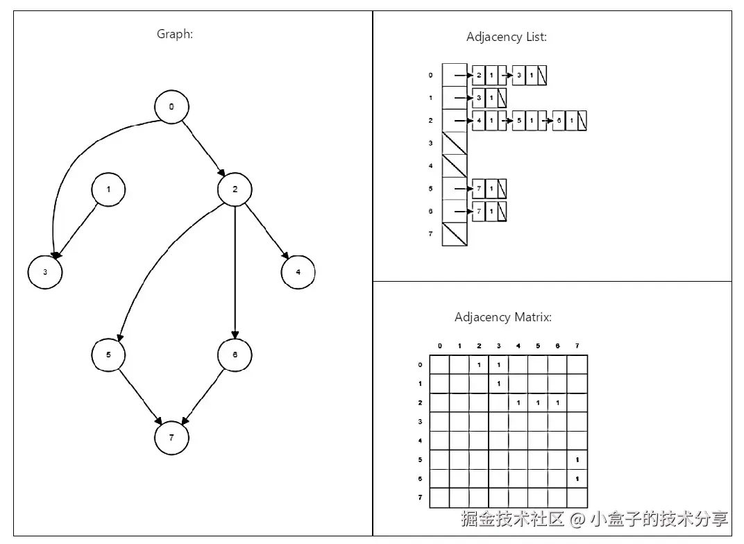 邻接矩阵将图表示为一个二维矩阵。如果我们的图有 N 个节点,我们将有一个 N×N 的矩阵,其中每个单元格(i, j)表示顶点 i 和顶点 j 之间是否存在边。
