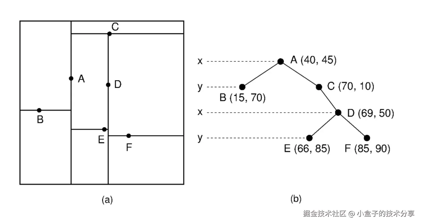 一棵二叉树,其中每个节点代表 k 维空间中的一个点。该树通过递归地在其中一个维度上分割空间来构建。在树的每一层,数据根据一个维度进行分割,后续的每一层交替使用维度。这使得它在范围查询和最近邻搜索中非常高效。