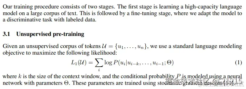 这就是 GPT 初代论文【Improving Language Understanding by Generative Pre-Training】中的模型建模公式。下图为论文中的建模公式,你可以从论文中仔细对比理解这个公式,除去公式中的字符不同,其它完全一致。