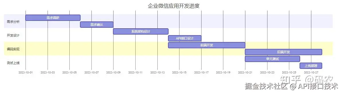 在开发企业微信应用时,合理安排开发时间也非常重要。以下是一个甘特图示例,描述了一个典型企业微信应用的开发进度安排: