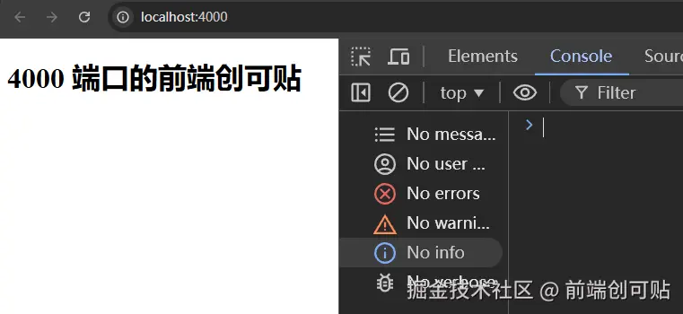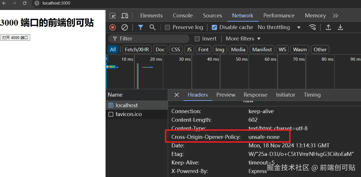依然是通过 Express 框架运行两个页面,一个页面地址是 http://localhost:3000,另一个是 http://localhost:4000,我们先来看看设置了 unsafe-none,其实也就相当于没有设置,两个页面可不可以通信: