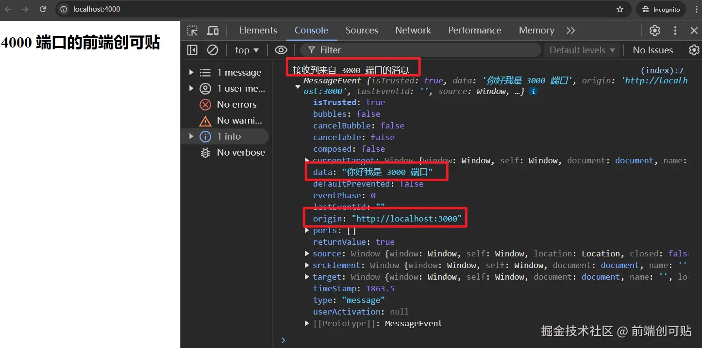 可以看到,4000 页面可以接受到 3000 端口的消息,不受 COOP 为 unsafe-none 的影响。