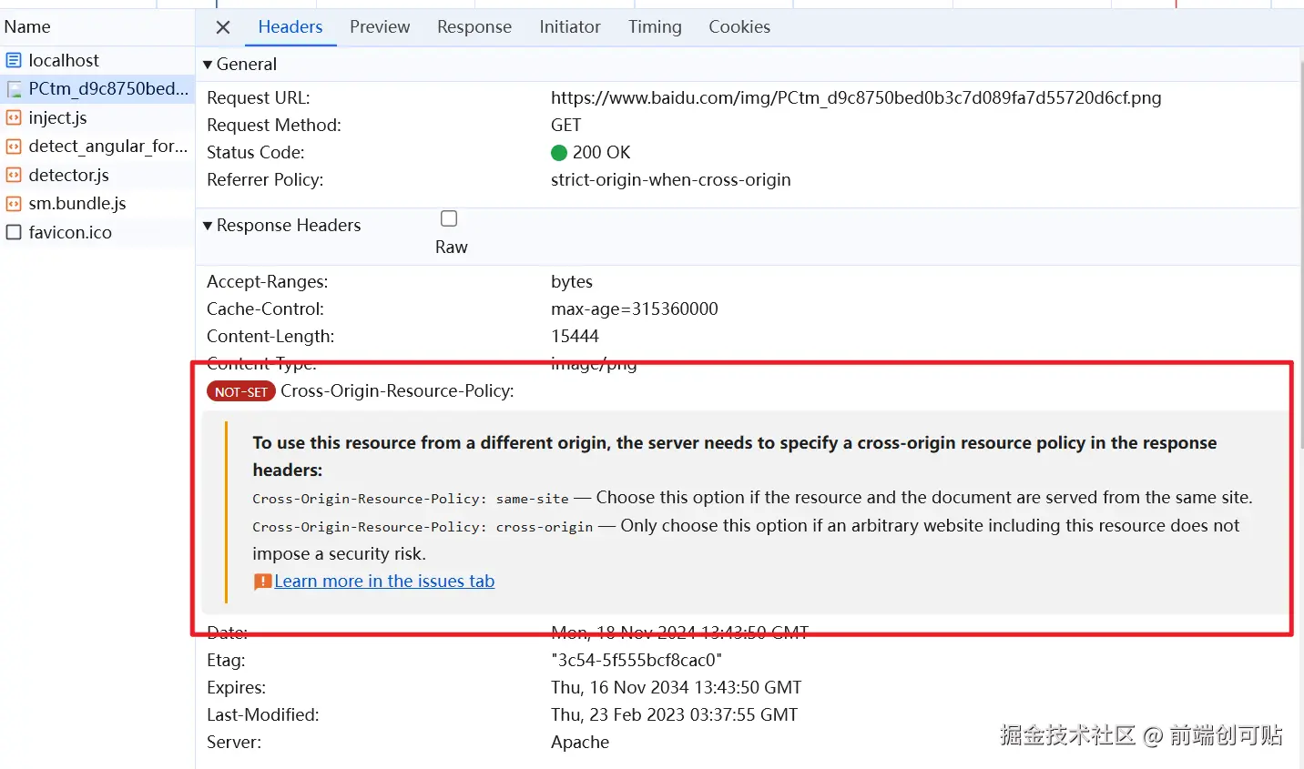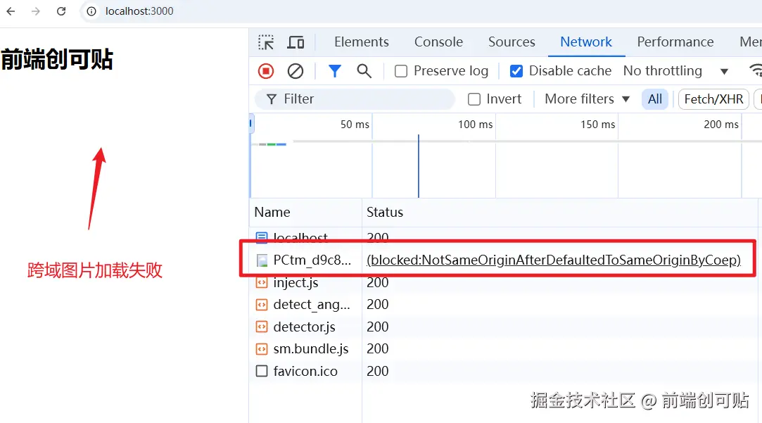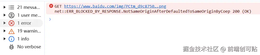 可以看到,浏览器的响应头为我们提示了错误信息,所以,当 COEP 的值为 require-corp时,跨域资源必须得有 CORS 协议或 Cross-Origin-Resource-Policy 响应头给予明确的授权才可以正常访问。