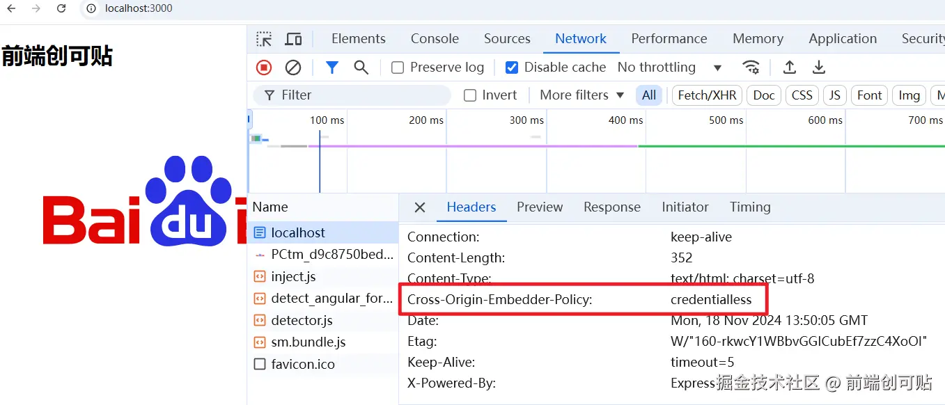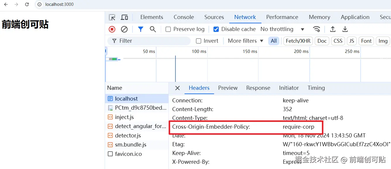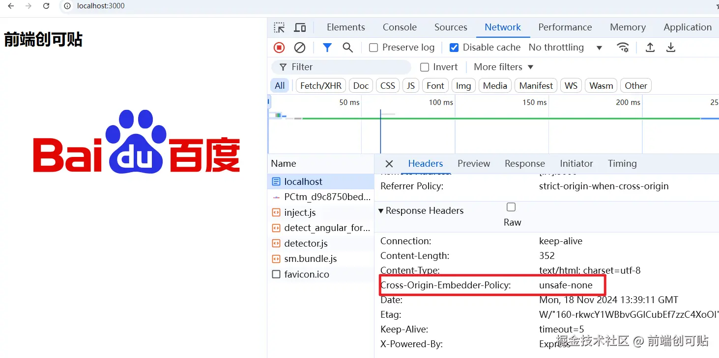 咱们再来测试一下,仍然是通过 Express 框架,我们打开一个 http://localhost:3000 页面,并且设置 Cross-Origin-Embedder-Policy 响应头。
