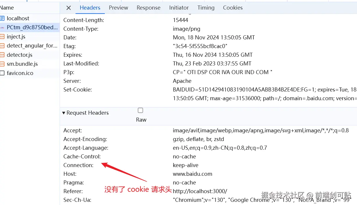 可以看到,响应头正确设置,并且图片也正常返回,而且图片也正常携带了 cookie(我访问过百度页面,所以会携带 cookie)。所以,COEP 为 unsafe-none 时不会对跨域资源有任何影响。