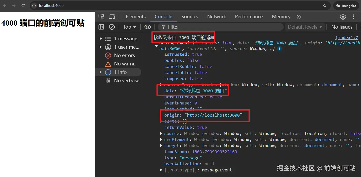 popup.postMessage('你好我是 3000 端口', 'http://localhost:4000');