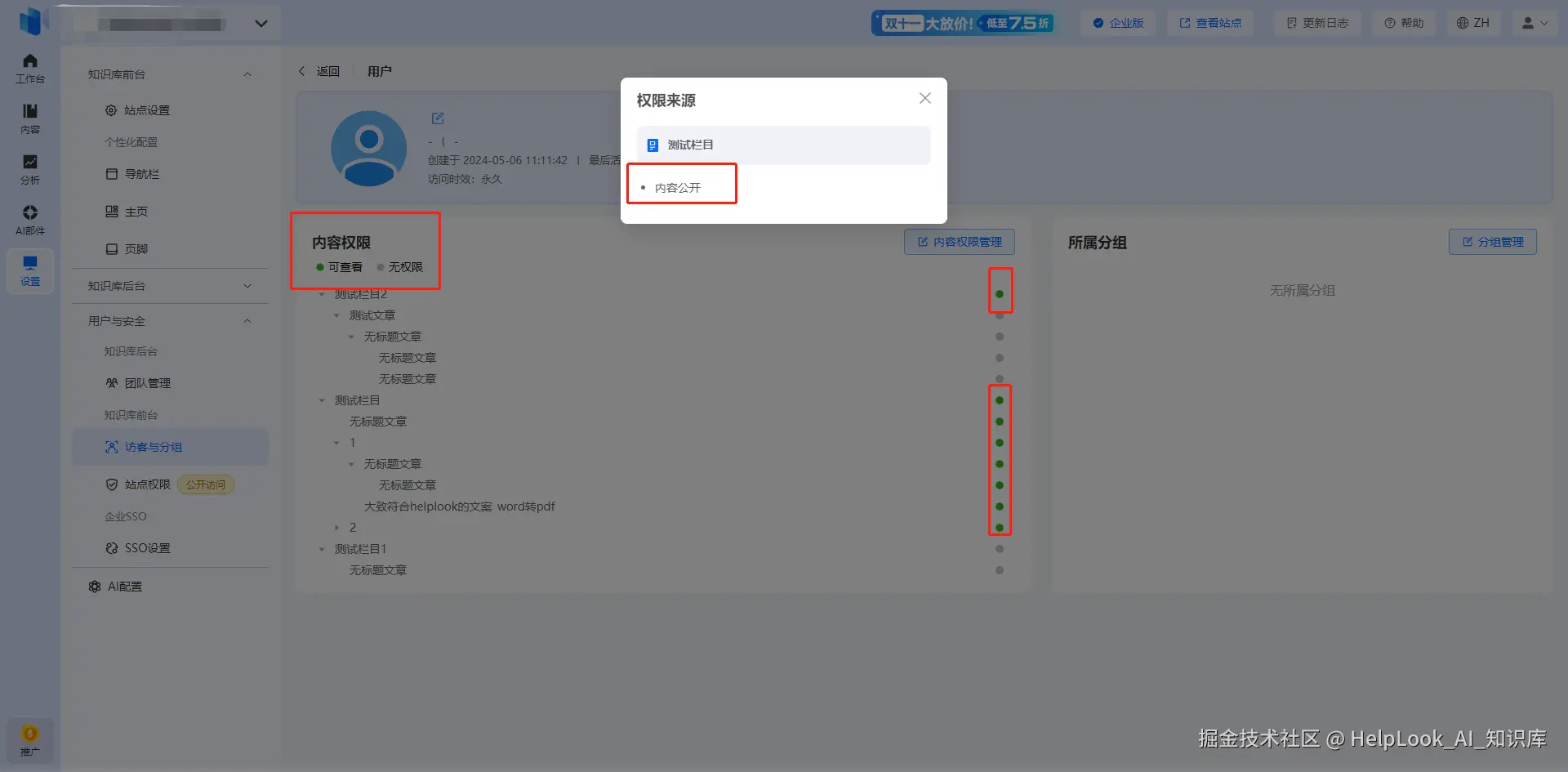 在内容权限栏中右上角的【内容权限管理】可以编辑当前用户/分组对于内容的【单独设置】,满足个性化需求。
