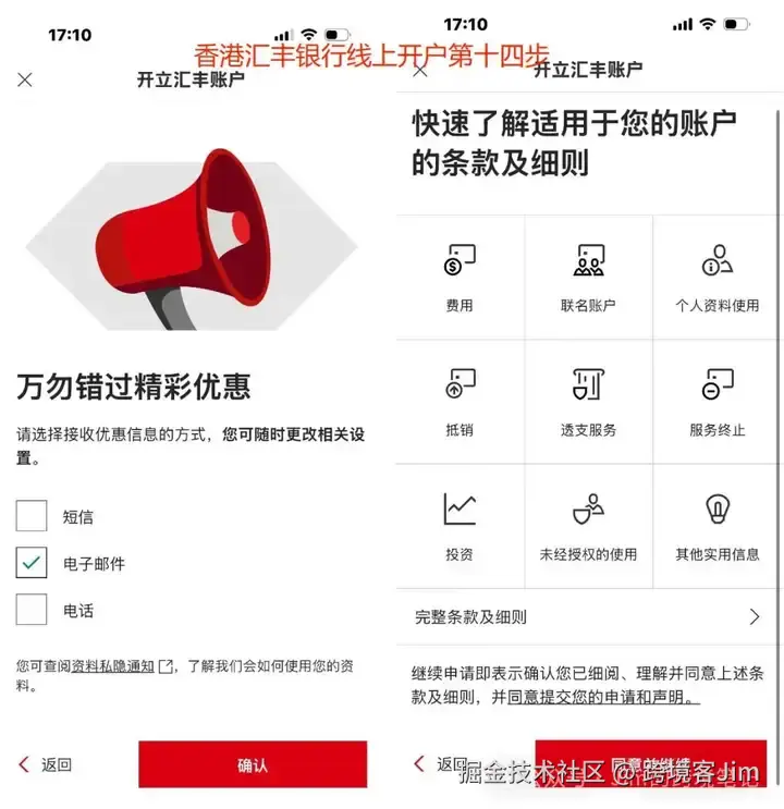 后面是汇丰银行的推销信息接受方式,根据个人情况,我自己一般选择电子邮件接收优惠信息,然后可以查看账户的费用等资料。