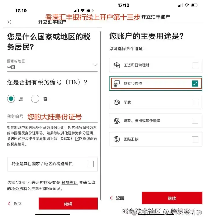 接下来,填写开户原因:打算在香港储蓄/投资,我们在【线下汇丰网点开户】时,面对客户经理的面谈,一般说投资买港股,这是一个比较安全和合理的理由。这里储蓄和投资集合在一个选项里,选择该项即可。