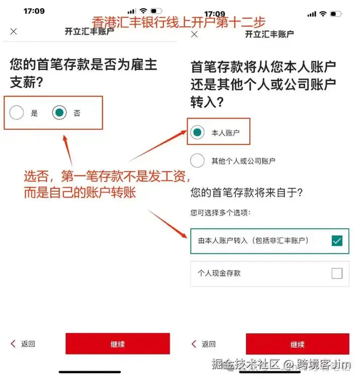 接下来,首笔存款是否为雇主支薪(工资), 选 否。首笔存款选择是从本人账户转入,您的首笔存款来自于:由本人账户转入(包括非汇丰账户)或个人现金存款,这两个都可以全选。