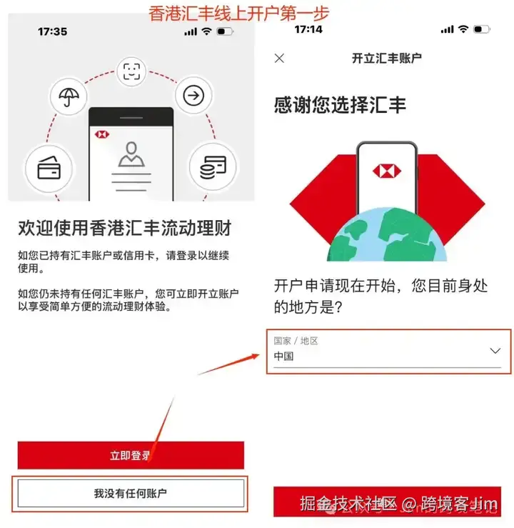 打开汇丰银行 app后,用户协议全部选择同意,进入到主页面,选择 我没有任何账户,目前身处中国。
