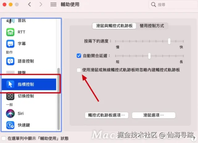 接着在「辅助使用」视窗左边的清单中往下拉,找到「指标控制」这个项目,点击后,在右边就可以看到一个「使用滑鼠或无线触控式轨迹板时忽略内建触控式轨迹板」的选项,将它勾选起来后,就可以暂时关闭处控制轨迹板了。