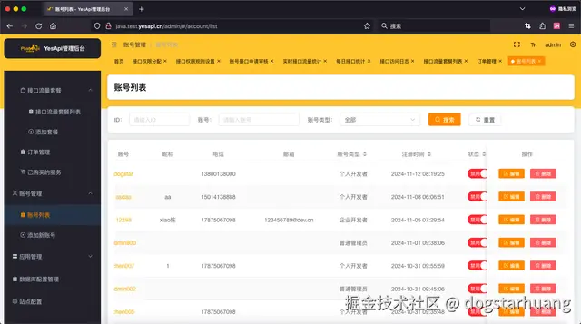 账号的查看和管理,包括:开发者账号、管理员账号、普通用户账号等。也可以在管理后台直接添加新账号、重置密码、禁用账号等操作。
