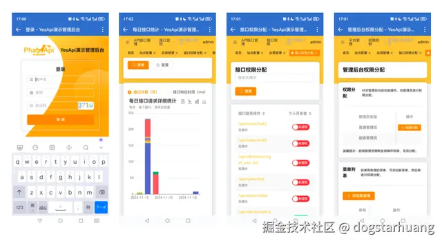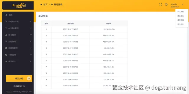 在后台首页,可以快速查看诸如:待审核应用、全部账号、今日接口请求次数、全部接口数量等整体概况。以及:接口流量统计图表、近期统计表格数据、昨日活跃App和系统授权信息等。
