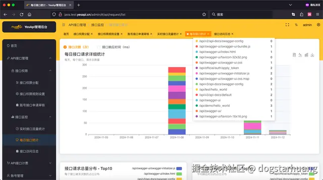 - 接口流量统计:根据接口请求日记实时统计最近30天的接口流量(排除开放平台和管理后台接口请求)