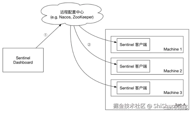 push模式:控制台将配置规则推送到远程配置中心,例如Nacos。Sentinel客户端监听Nacos,获取配置变更的推送消息,完成本地配置更新。